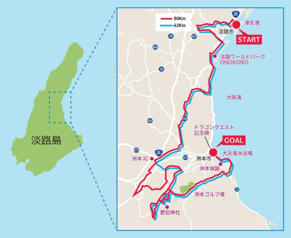 コースマップはこんな感じで「50km」と「42km」のコースがあります。「淡路市防災公園」が出発地点で、「洲本市民広場」がゴール会場です。