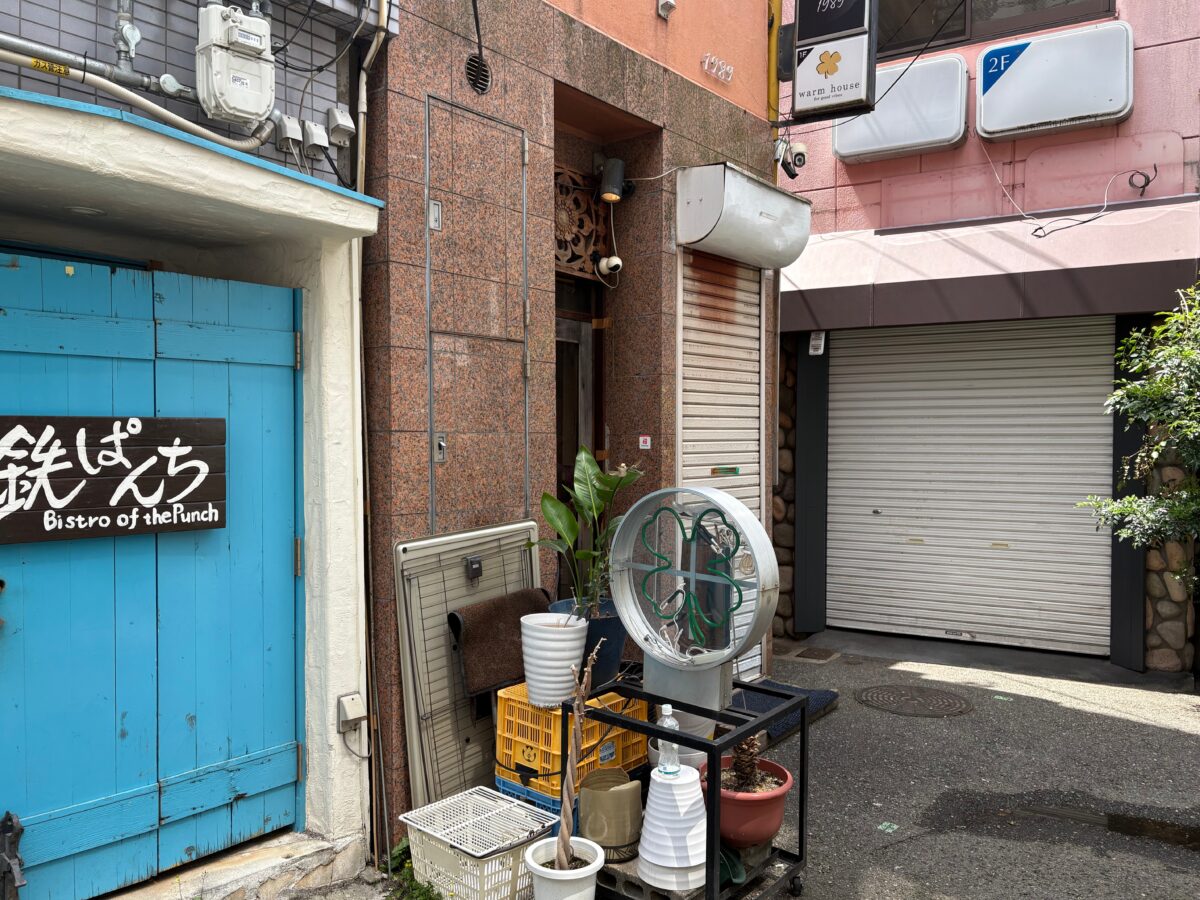 そのまま真っすぐ進むと見えてくるピンク色のビルの一階が「橙(だいだい)」です。向かいには「warm house」っていうバーがあります。
