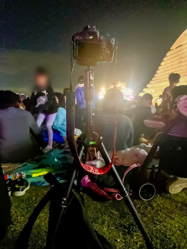 この花火大会は三脚利用の禁止エリアはありませんが、一般の観覧の方の邪魔にならないよう、普段より低めにセットし、私も座って観覧します。
