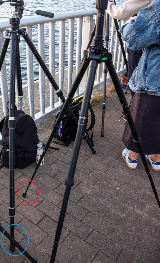 右(赤丸)が私の三脚、左(青丸)が貸してもらった三脚。脚の太さが全然違いますね