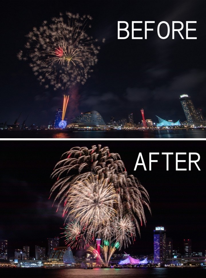 ビフォー・アフターを比べてください。撮影場所や花火の規模が違うので単純な比較はできませんが、かなりいい感じになったと思いませんか?