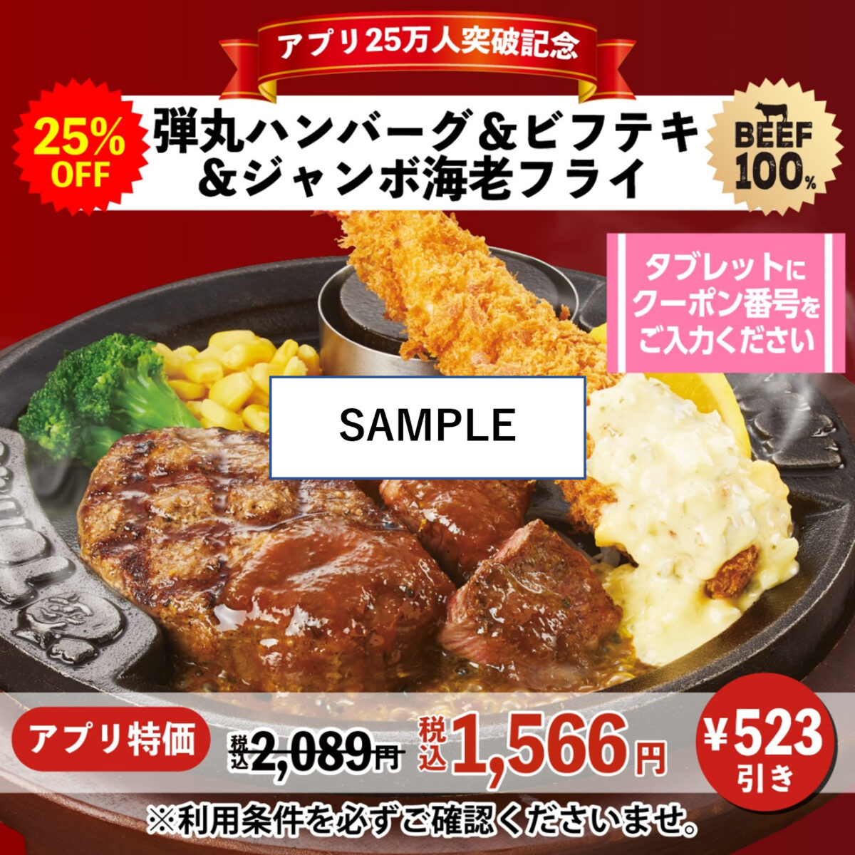 「弾丸ハンバーグ&ビフテキ&ジャンボ海老フライ」は523円引きの1,566円(税込)に。