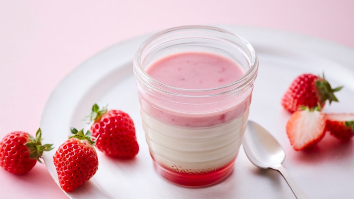 ミルク感のあるやさしい甘さのいちごプリンに、より“いちご感”を感じられる、つぶつぶとした果肉食感を残した色鮮やかな「いちごゼリー」が重なっています。