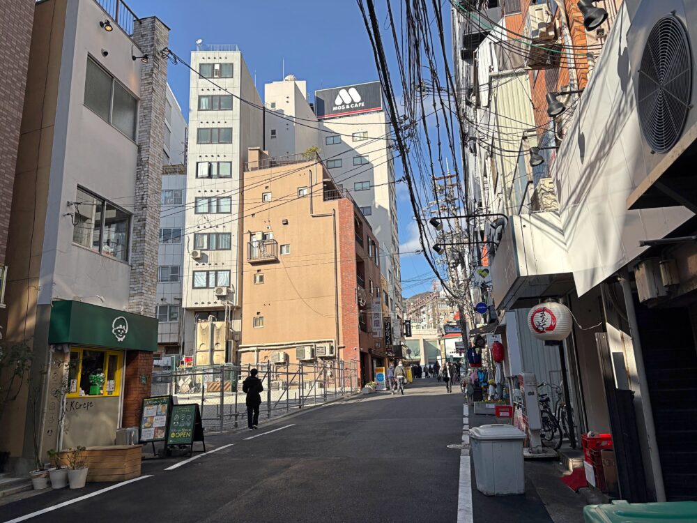 北側を向くと、このような感じ。同じ通りには「世界一暇なラーメン屋元町店」や「モスバーガー」があります。