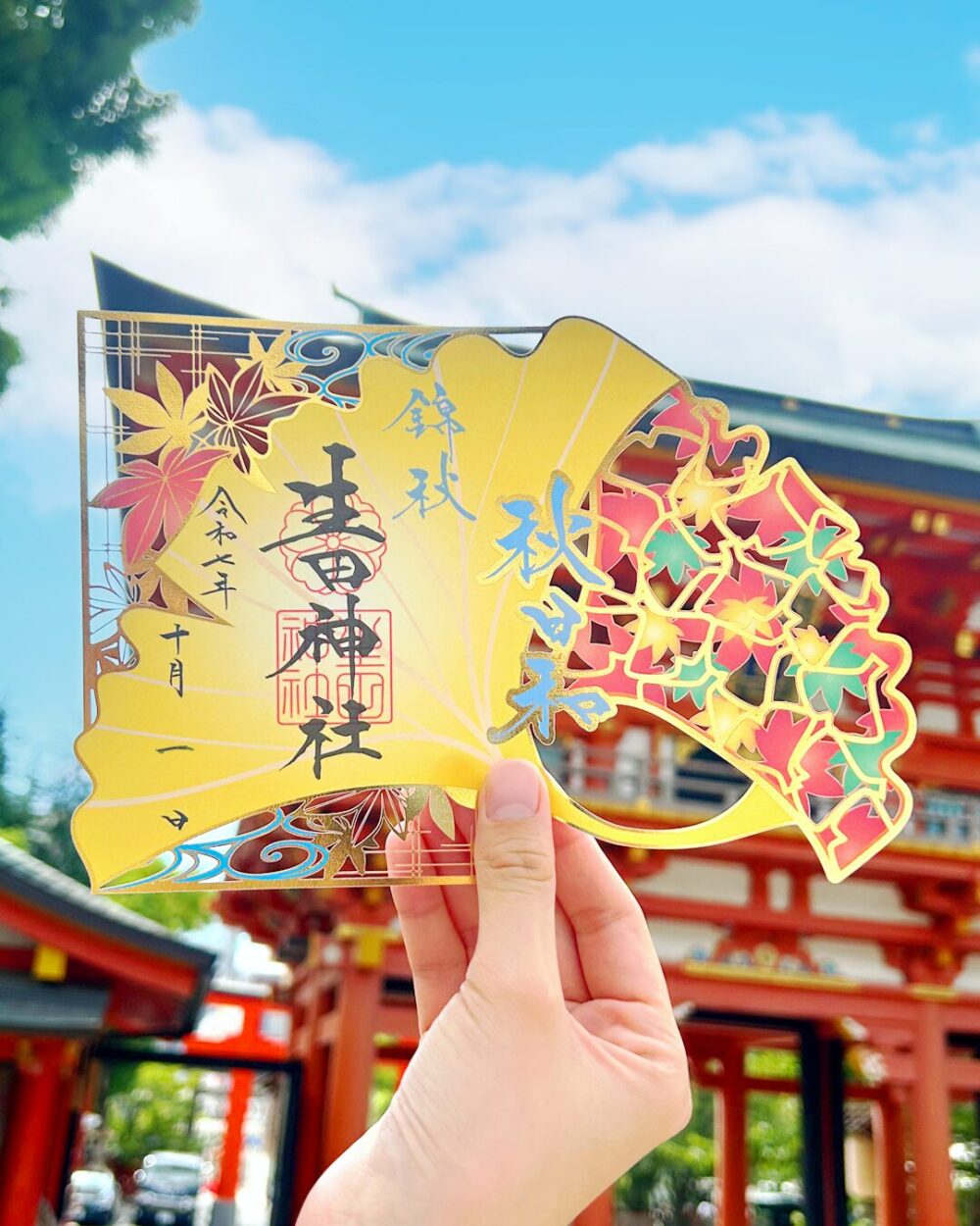 秋に空気が澄んで抜けるように青い、穏やかでさわやかな晴天という意味の「秋日和」の文字を配し、イチョウや紅葉が色づき始めた晴わたる秋の風景をイメージして、切り絵で表現された御朱印です。
