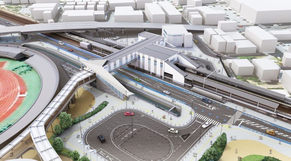 また、駅舎や自由通路は、スポーツ施設との一体感を意識した色調や開放感のある形状が採用され、スポーツ観戦の高揚感を表現した爽快でスピード感のあるデザインになるそうで、そのあたりも楽しみですね。