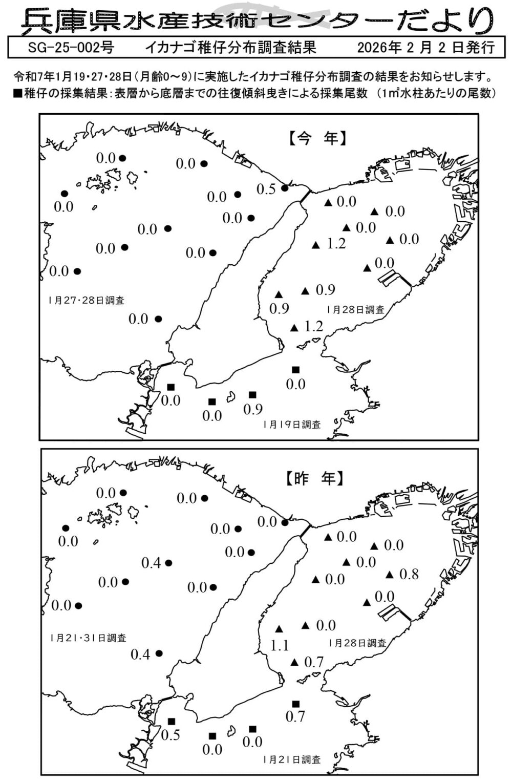水産資源の持続的利用や水産物の安定供給のため研究・開発を行っている「兵庫県立水産技術センター」が、今春のイカナゴ漁に向けた「イカナゴ稚仔分布調査結果」を発表しています。