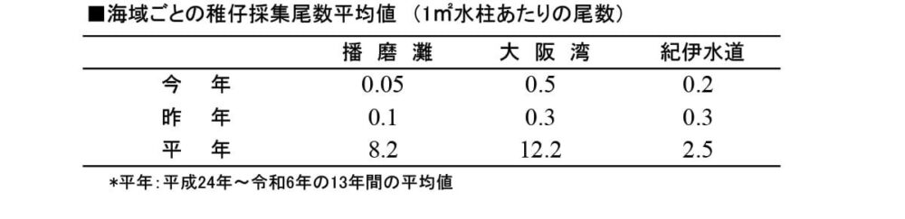 「大阪湾」海域では2024年から2年間休漁の対策を取ったためか、昨年より少し高い0.5という数値が出たみたいですが、それでも平年(12.2)を大きく下回る結果となってます。