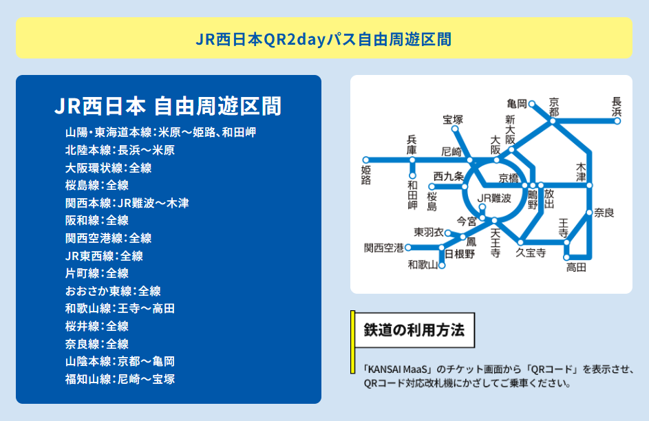 「KANSAI MaaS」アプリは、関西の鉄道事業者連携によるおでかけ応援アプリです。『JR西日本QR2dayパス』は「KANSAI MaaS」でのみ販売されます。※駅の窓口や券売機での販売はありません。