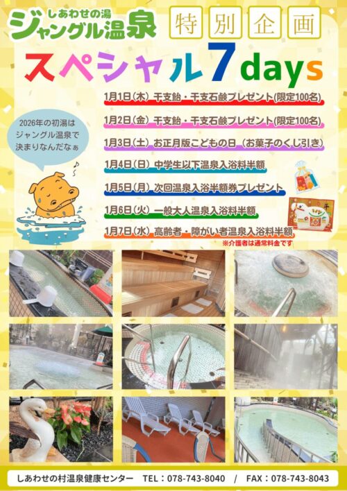 しあわせの村にある「ジャングル温泉」で、1月1日から7日間、毎日イベントが開催されます。