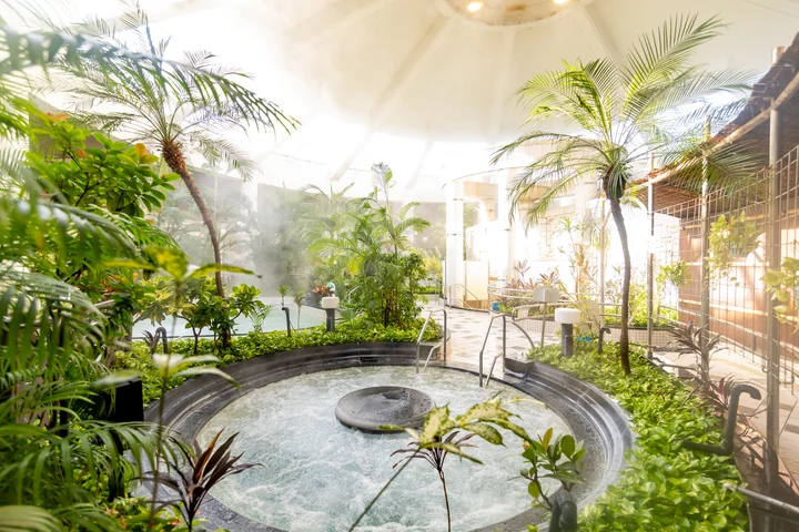 「ジャングル温泉」は、しあわせの村の中にある温泉施設。障害のある人や高齢者でも使いやすい、広々としてゆったりと入れる10種類のお風呂が楽しめます。