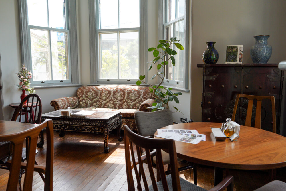 大きな窓からは自然光がやさしく差し込み、アンティーク調の家具が広がるスペースは、まるで映画の1シーンのような特別感があります。