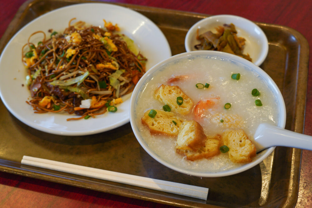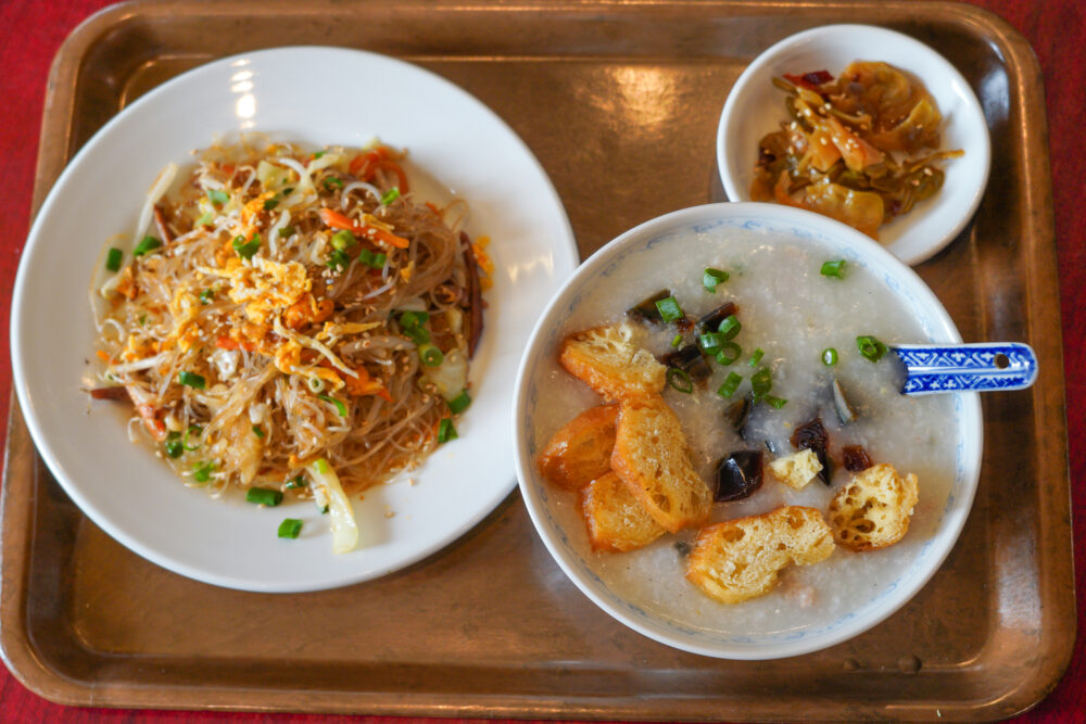 もう一つの朝食セット「ピータン粥と焼きビーフン」も人気で、どちらもあっさりながら満足感たっぷり。朝からモリモリ食べられます。