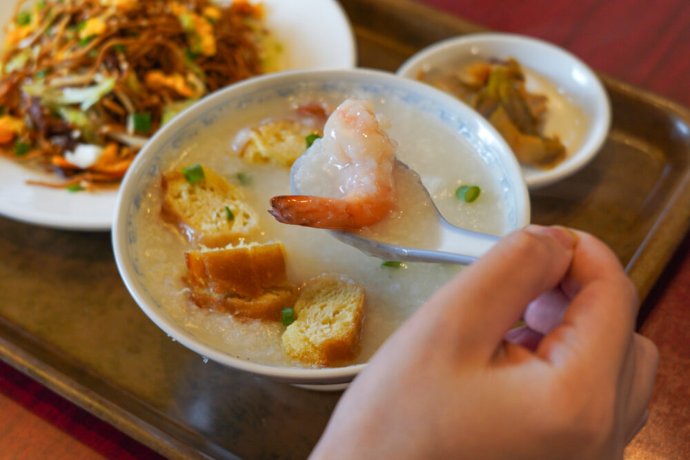 看板メニューの「海鮮粥」は、ぷりぷりの海老やイカ、揚げパン(油条)が入った贅沢な一品。ほどよい塩加減と魚介の旨味が絶妙で、朝の体にやさしく染み渡ります。