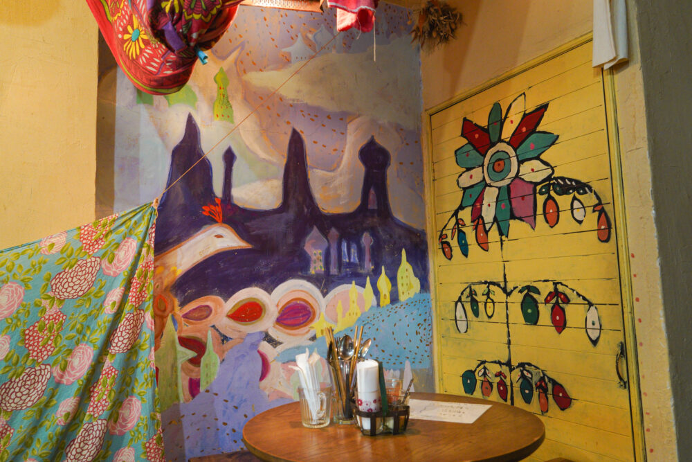 店内はアンティーク家具やユニークな雑貨、本に囲まれた異国情緒あふれる空間で、知人アーティストや奥様のアートも飾られ、どこか温かみを感じます。