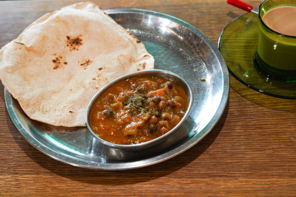 こちらは、モーニングメニューのミニカレーとチャパティ、チャイのセット。