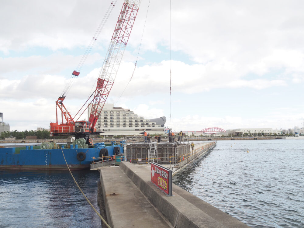 防波堤の北側「京橋エリア」では、「船溜まり」の埋め立てが計画されていて、「船溜まり」がかなり南側へくる分、波の影響を受けやすくなるので「防波堤」を長くする工事が行われています。