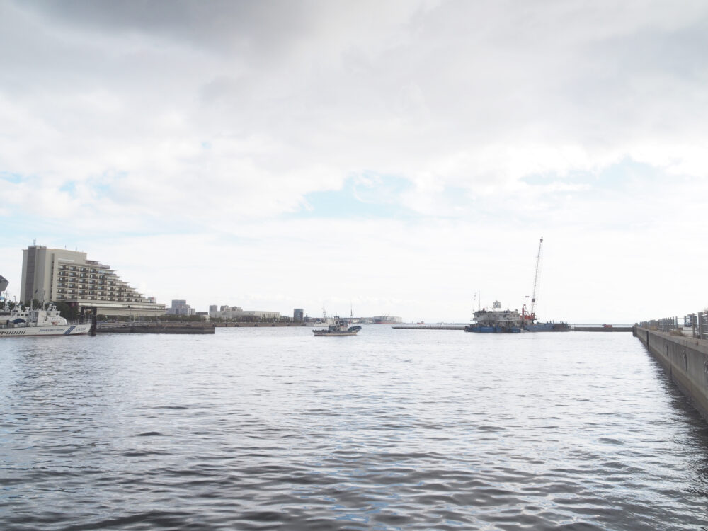 メリケンパークの東端で工事中の「防波堤」が、かなり長くなってきてます。