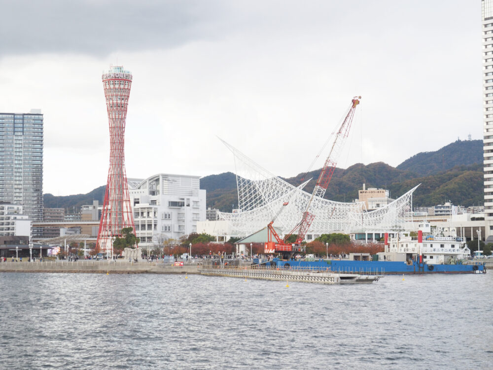 「防波堤」を作っているのは、メリケンパークの南東角。対岸が「みなと温泉 蓮」で奥に神戸大橋が見える場所です。