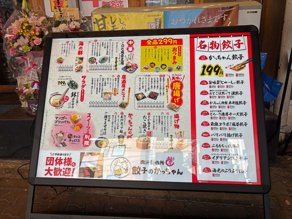 看板メニューの「かっちゃん餃子」は219円、「ハイボール」は何杯飲んでも109円、「生ビール」も329円と、コスパの良さが魅力的です。