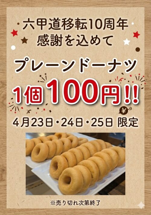 JR六甲道駅の近くにあるドーナツ専門店「神戸べいくろーる」が、六甲道移転10周年を記念したセールを開催するそうです。