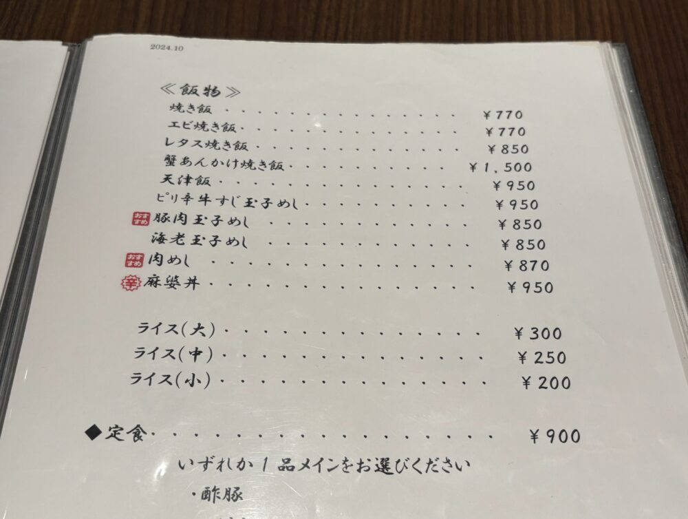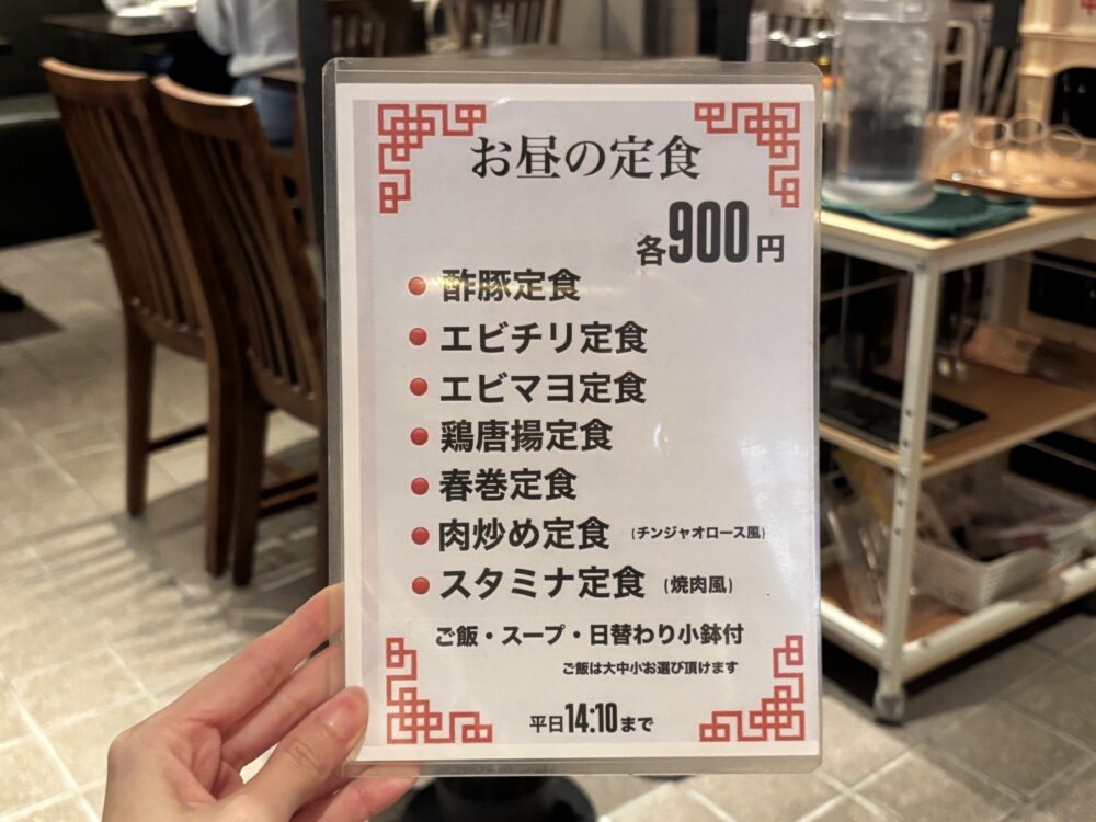お昼の定食として、「酢豚定食」「エビチリ定食」「鶏唐揚定食」などがあり、値段はどれも「900円」。
