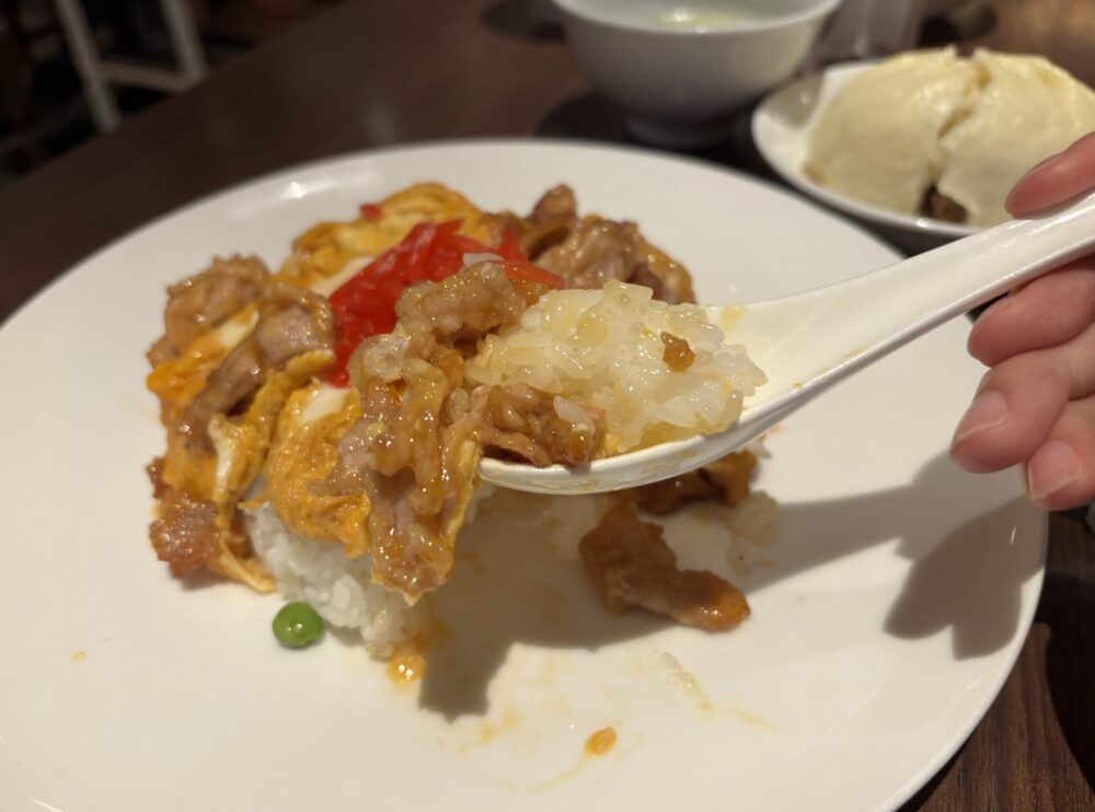 気になる見た目は、こんな感じ。豚バラ肉を半熟玉子でとじていて、上には紅ショウガ、グリーンピースも合わさっています。