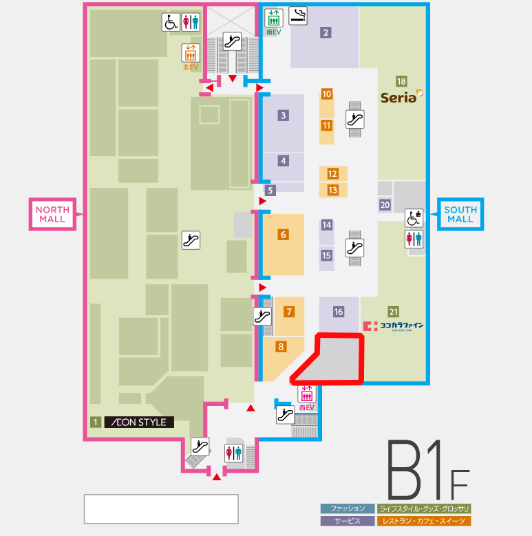 飲食店が入りやすいスペースとしては、赤で囲った地下1階の以前「ドコモショップ」が入っていた場所も空いています。