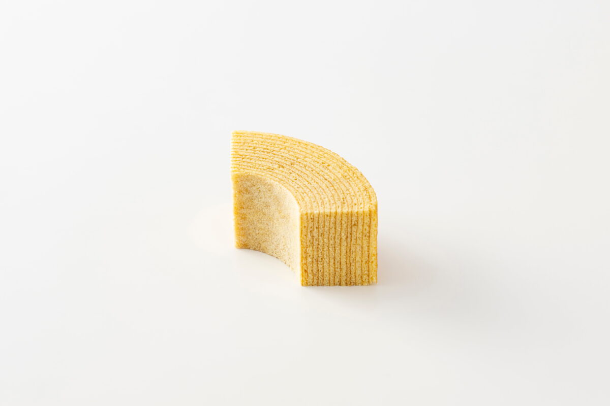 THEOが焼きあげたバウムクーヘンのリングサイズを1/4にカットしました。バウムクーヘンを焼いている様子を店内で実際に見ることができます。