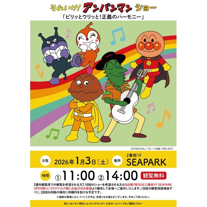 『それいけ! アンパンマン ショー』は全国各地で開催されていて、今回は明石が会場に。ショーは、11:00~/14:00~の2回に分けて行われ、無料で観覧することができます。