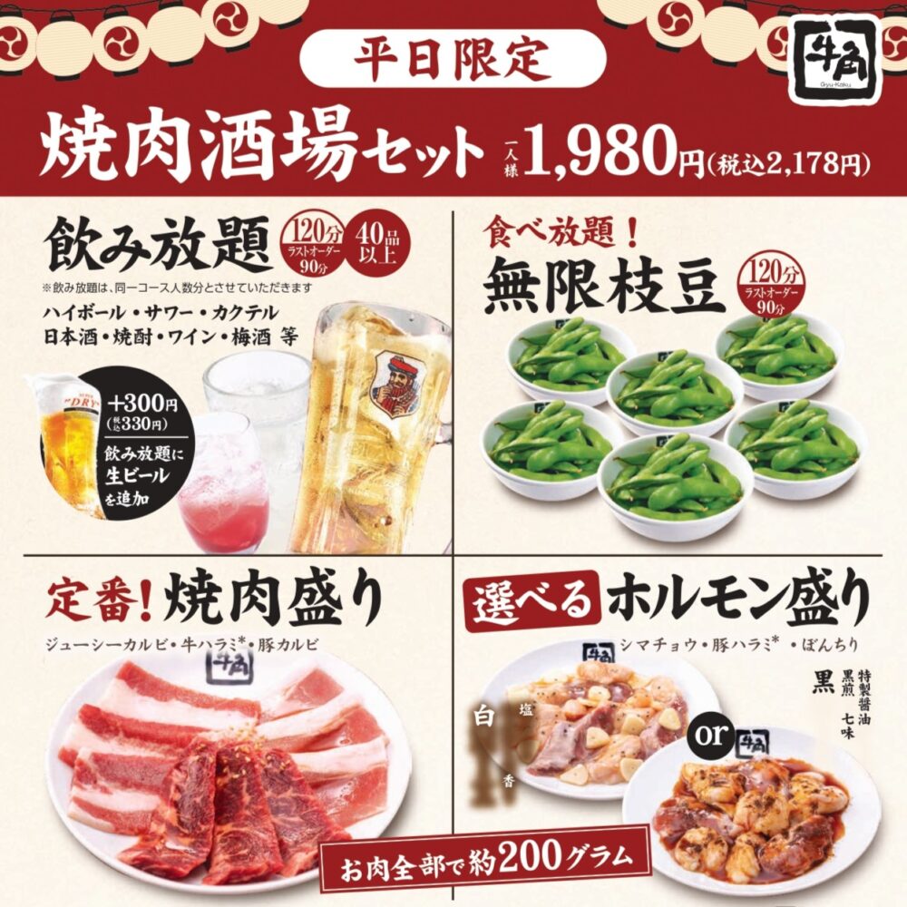 全国の「牛角」で、「定番焼肉盛り」と「ホルモン盛り」に、2時間飲み放題と枝豆食べ放題がセットになった「平日限定メニュー」が登場してます。