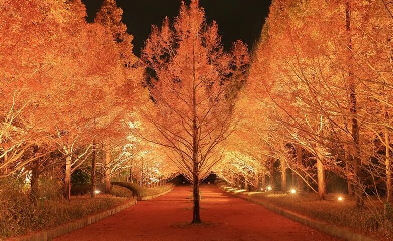 「秋のいろどりとイルミネーション」と題して、メタセコイア、イロハモミジ、ケヤキなどの紅葉のライトアップが楽しめます。フォトスポットベンチやあじさい坂の大木にもフルカラーイルミネーションが施されているそう。