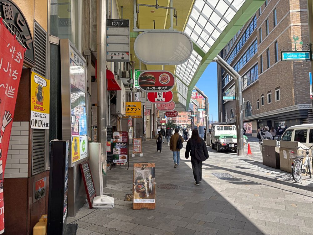 西側を向くと、こんな感じ。このまま進むと「磯丸水産」や「コメダ珈琲店」があり、さらに進むと「いくたロード」に出ます。