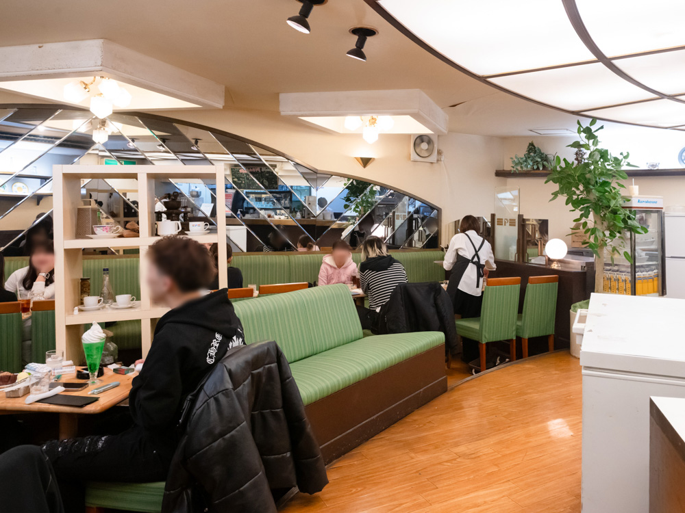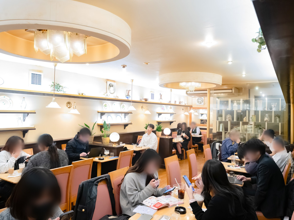 こちらのフロアも昔ながらの喫茶店の雰囲気で、シャンデリアが懐かしい感じ。訪れた日は金曜日の夕方で、若者を中心にかなりの賑わいです。