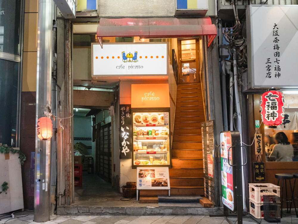 駅を出発し、「サンキタ通り」を西へ向かうこと徒歩約1分、カフェ ピカソに、到着! オープンして40年以上になるんだそうで、串カツ屋さんと焼き鳥屋さんに挟まれて、隠れ家のような佇まいです。