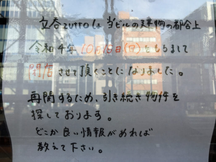 JR神戸駅北側の『立呑ZUTTO(たちのみずっと)』が閉店してる。移転先を探してるみたい