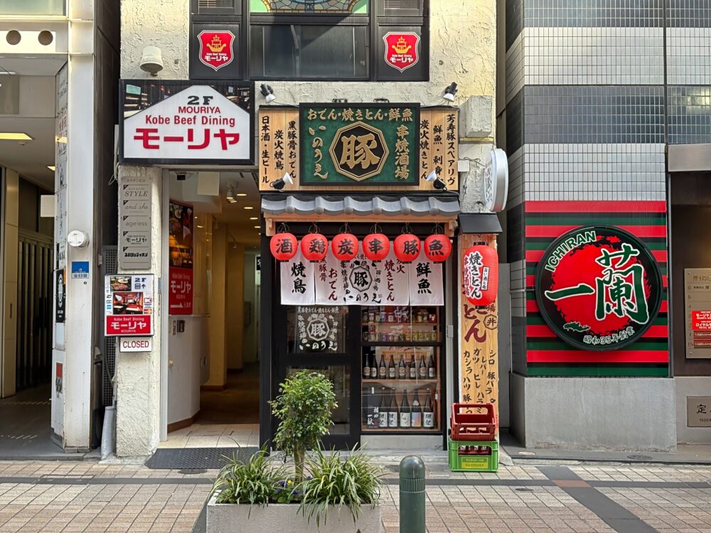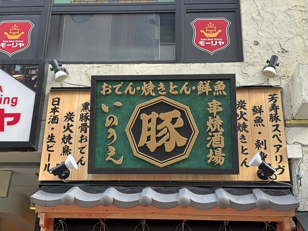 『おでん・焼きとん・鮮魚 串焼酒場いのうえ』ができたのは、阪急三宮駅から北に歩いてすぐ、いくたロードの東側。隣には、ラーメン店「一蘭」や、ステーキレストランの「ロイヤルモーリヤ」があります。