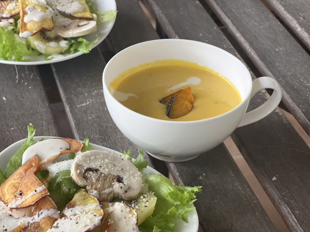 かぼちゃのスープはどろっとした濃厚で飲み応えのあるもの。余計なものは使っていないようで、かぼちゃを口いっぱいに感じます。