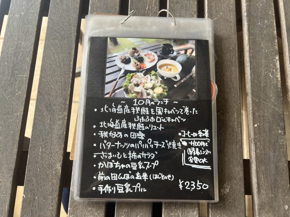 メニューは複数ありますが、人気は月替りランチ。複数のおかずとお店の前の田んぼで採れた玄米がワンプレートになっていて、季節の野菜を使ったスープ・サラダ・デザートと食後の飲み物までついてきます。