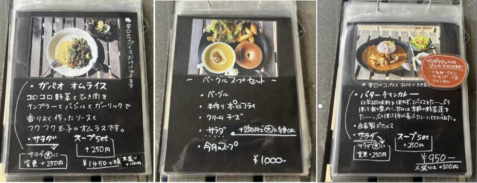 他には「ガパオ オムライス」「ベーグルスープセット」「バターチキンカレー」なども。月替りランチ同様にサラダがついていて、スープもプラス料金を払えばつけられるようです。