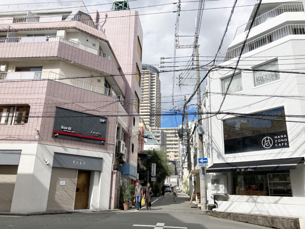 『Knot』の場所は、トアロードから1本西へ行った交差点にあるビルの1階。東側の向かいはクレープとガレットの専門店「CREPE & GALETTE TOOTH TOOTH」です。