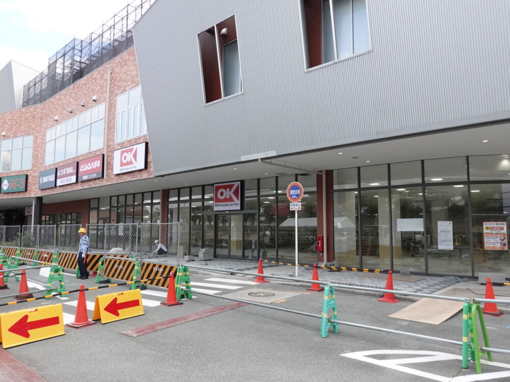 リニューアルの核テナントとなるディスカウントスーパー「オーケー」の看板が登場。以前、「業務スーパー」などがあったあたりですね。