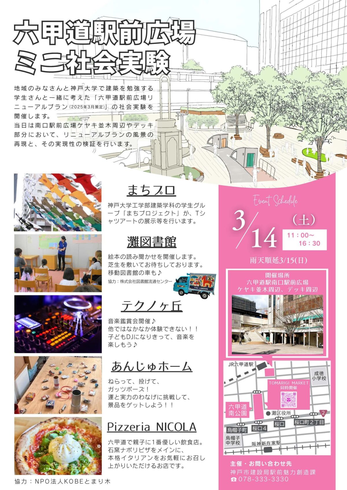 JR六甲道駅『駅前広場』で「リニューアルプラン」の風景を体験できる、「ミニ社会実験」が開催されます。南口の広場やデッキ部分にベンチなどが設置されます。