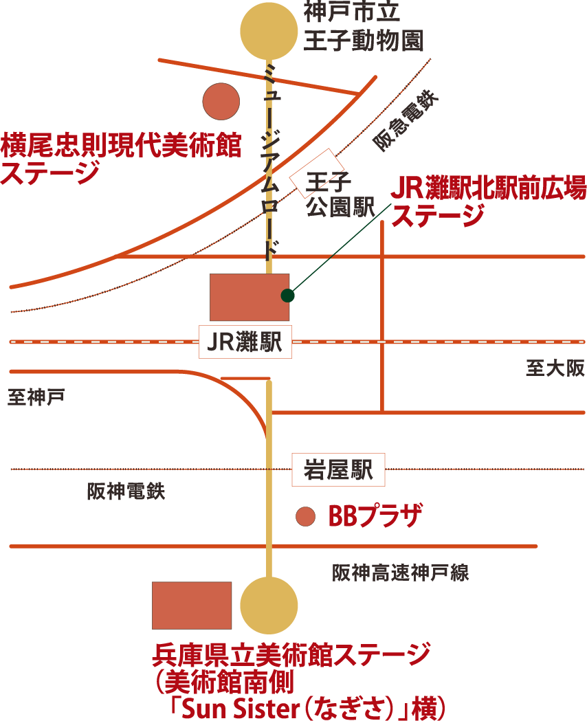 周辺には神戸文学館・横尾忠則現代美術館・兵庫県立原田の森ギャラリー・BBプラザ美術館など、多くの文化施設が集まっているエリア。