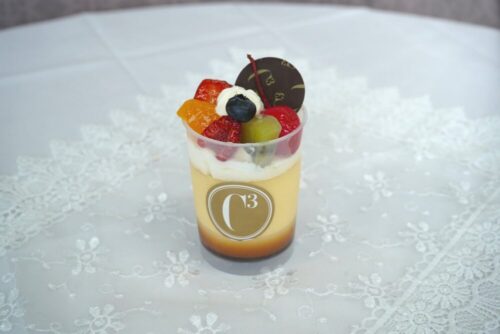 バナナ・イチゴ・オレンジのフルーティーな香りが広がる、軽やかなマロンムースがベース。中には濃厚なプリンとキャラメルを閉じ込め、クラシックをモダンに仕上げた、Masahiko Ozumi Paris流のプリン・ア・ラ・モードです。