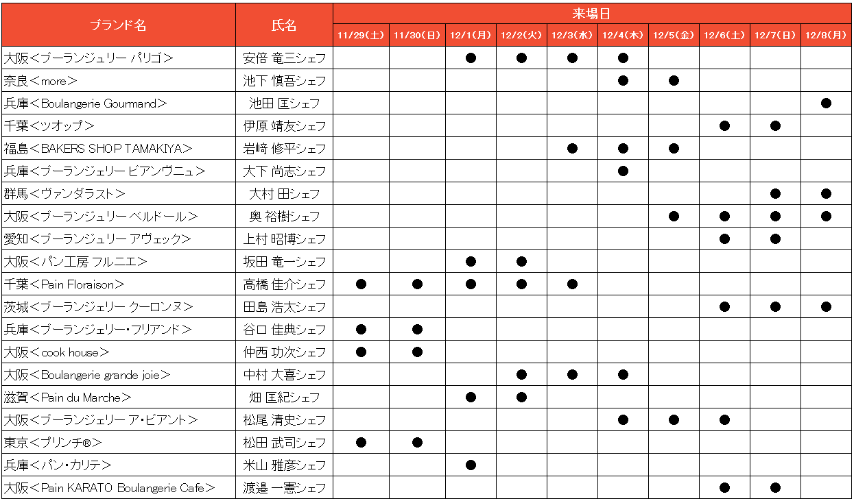 大阪で大人気の「ブーランジュリー パリゴ」の安倍 竜三シェフを筆頭に、全国各地から10日間で20名のシェフが日替わりで来場し、会場でこだわりのパンを焼き上げます。