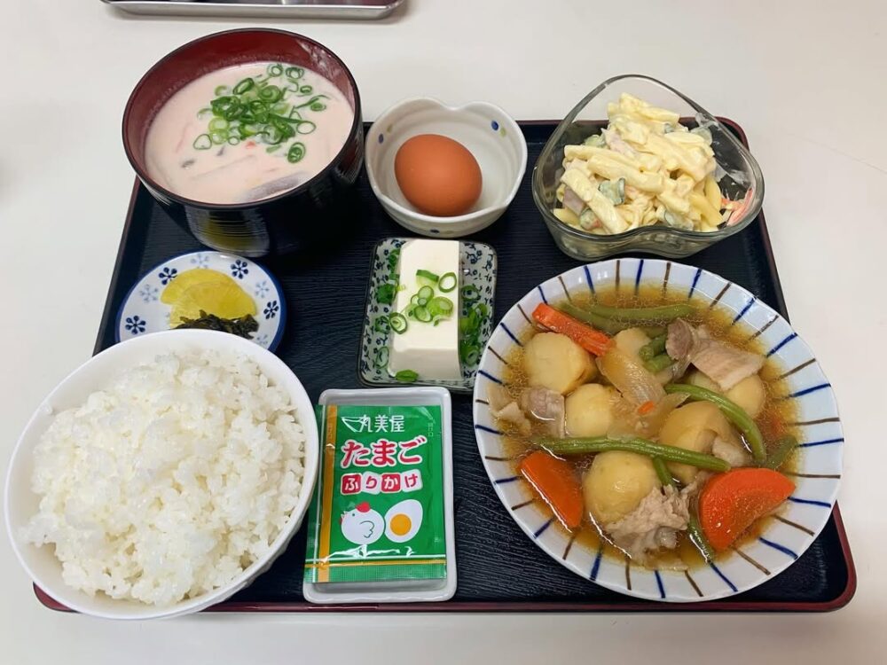 「そうざい定食」は自分で好きなお惣菜を2品取り、温めてもらうスタイル。ご飯・汁もの・生卵・小鉢・漬物などがセットになっていて、ボリューム重視の人にもおすすめです。