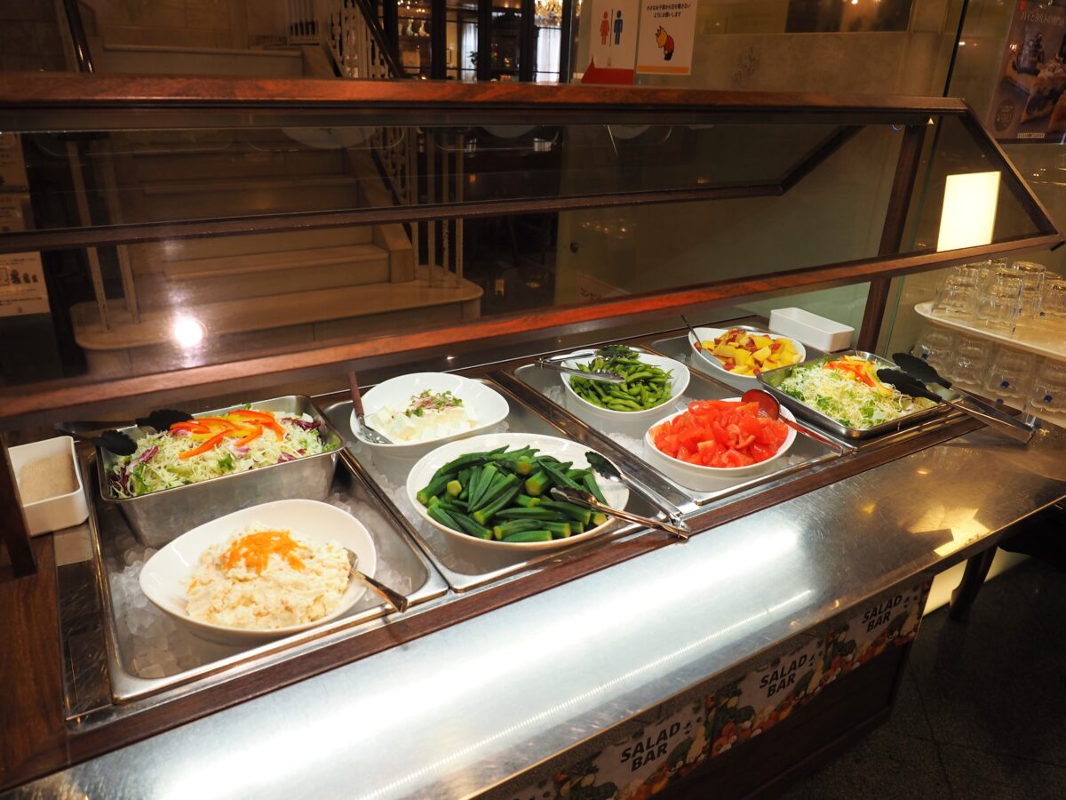 以前は1人前ずつ盛られた「サラダ」がショーケースに並んでいましたが、現在はサラダブッフェスタイルで提供されています。野菜の種類も前とは少し変わっていて、苦手なお野菜は避けたり・好きな野菜はたっぷり盛ったりと自分好みで調整も可能。