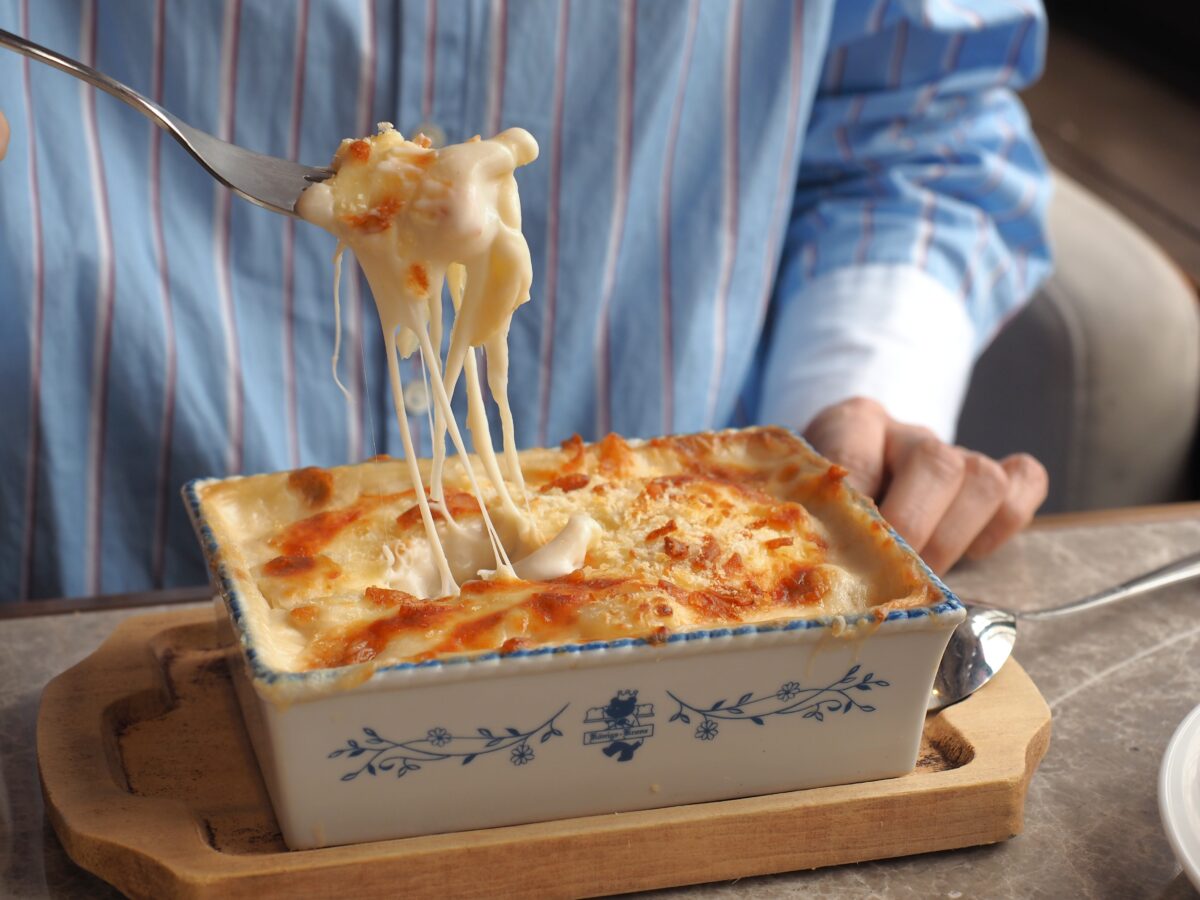 中には、えび・野菜・きのこ類・マカロニが具だくさんに入っていて、食べ応えしっかり。たっぷりのチーズも香ばしく焼き目がつけられていて、パンとの相性も抜群です。