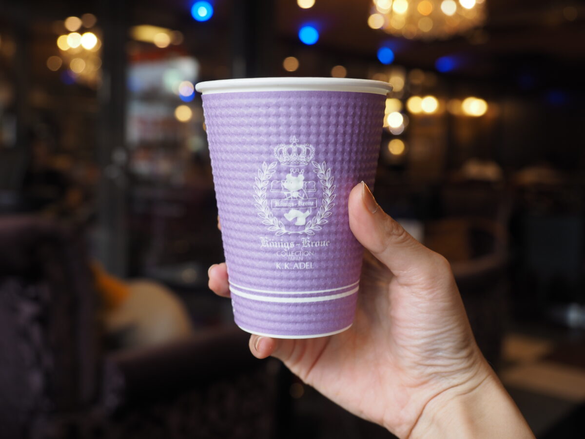 カフェラテ以外のすべてのドリンクは、2杯目以降はセルフサービスで好きなものを好きなだけ。セルフコーナーに置かれたカップも紫色で可愛らしいですね。